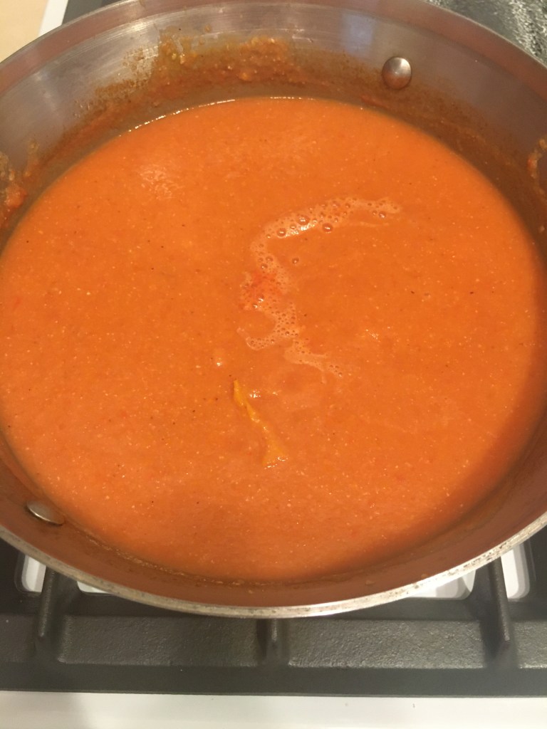 Place broth and washed lentils in a pot with the now roasted peppers, tomatoes and sautéed onions. Allow to simmer for up to an hour.