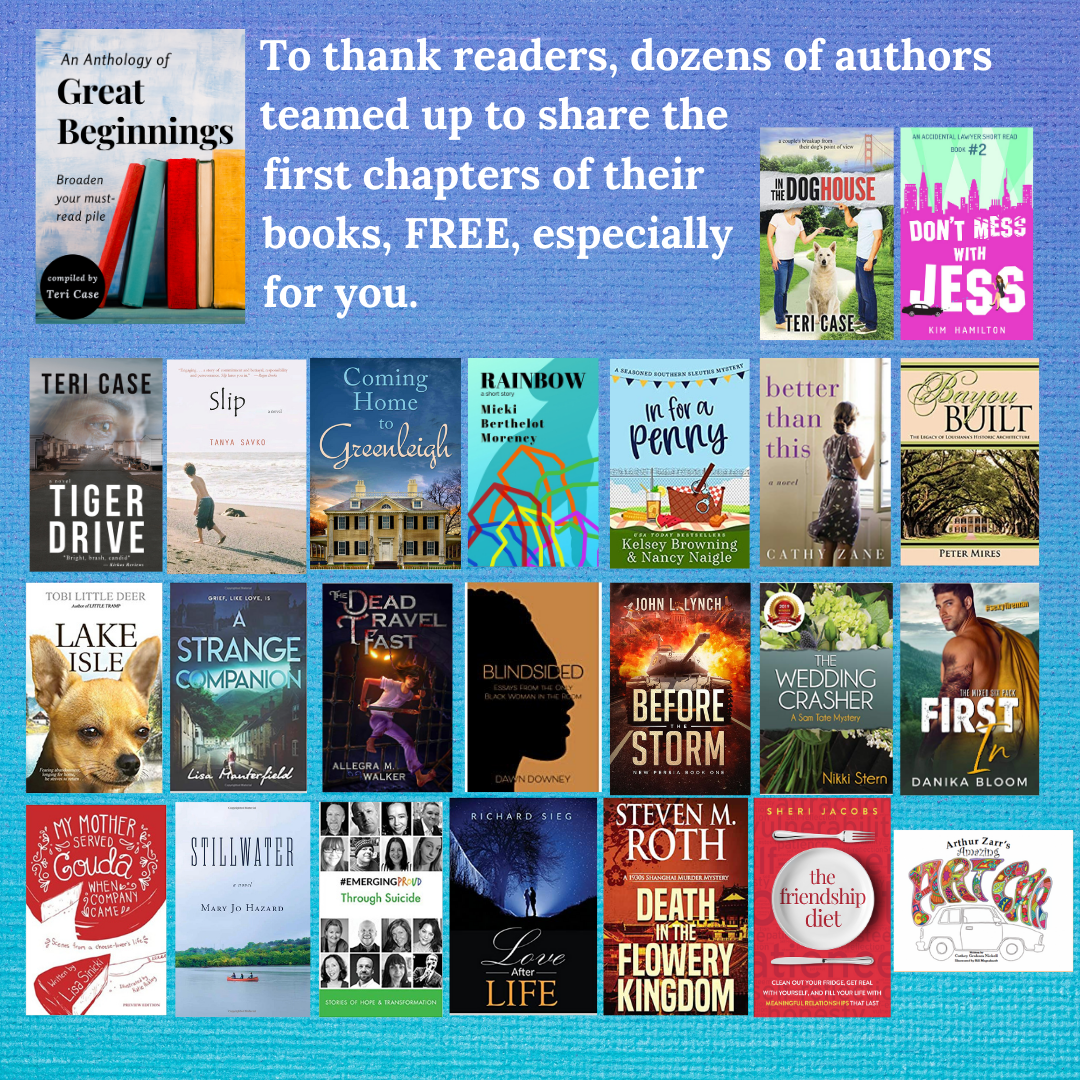 (1)Teri Case, the author of TIGER DRIVE and IN THE DOGHOUSE (a personal favorite:) offers gift-givers the chance to read GREAT BEGINNINGS: AN ANTHOLOGY, for free. Here’s the link: https://BookHip.com/NMLQAW