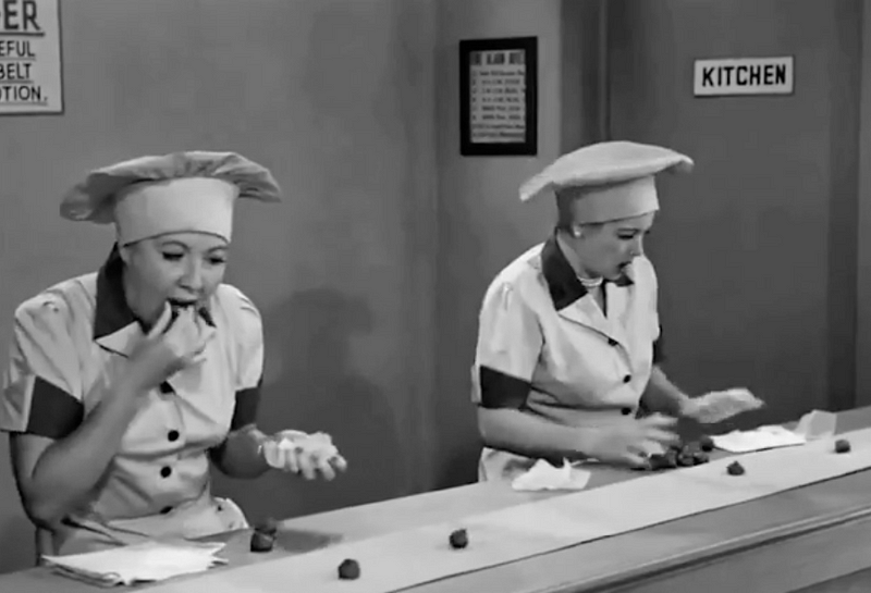 Lucille Ball and Vivian Vance struggle to wrap chocolate candies on a conveyer belt. (Credit: YouTube)